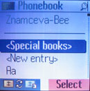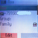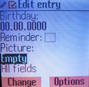 Имени, записанному в справочник телефона, можно присвоить следующую информацию: фамилию, телефон, телефон (офис), телефон (мобил.), факс, факс 2, E-mail, E-mail 2, URL, группу (всего их 7), компанию, улицу, почтовый код, город, страну, день рождения (с напоминанием), картинку (например, загруженное фото - при звонке оно будет выводиться на дисплей). Для тех, кому не нужен столь длинный список данных, предусмотрен сокращенный вид полей. Для каждой группы можно выбирать свой символ, новое название и свою мелодию вызова (отдельно взятому имени рингтон назначить нельзя). Одновременно может выводиться либо содержимое SIM-карты, либо памяти аппарата. Но зато списки можно быстро поменять - нажатием левой софт-кнопки, когда курсор находится на соответствующем пункте.