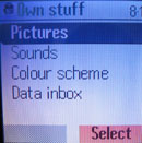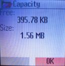 Отдельным пунктом в главном меню расположена папка "Мои файлы". Другими словами, это обычный файл-менеджер. Изначально в нем хранится 4 папки: картинки, звуки, цветовые схемы и данные. Судя по встроенному счетчику, в CF62 1,56 Мб доступной пользователю памяти - маловато будет. Это при том, что большая ее часть изначально занята всякими предустановленными приложениями и картинками.