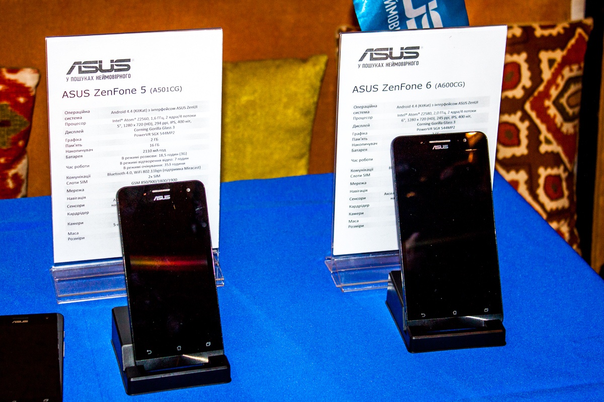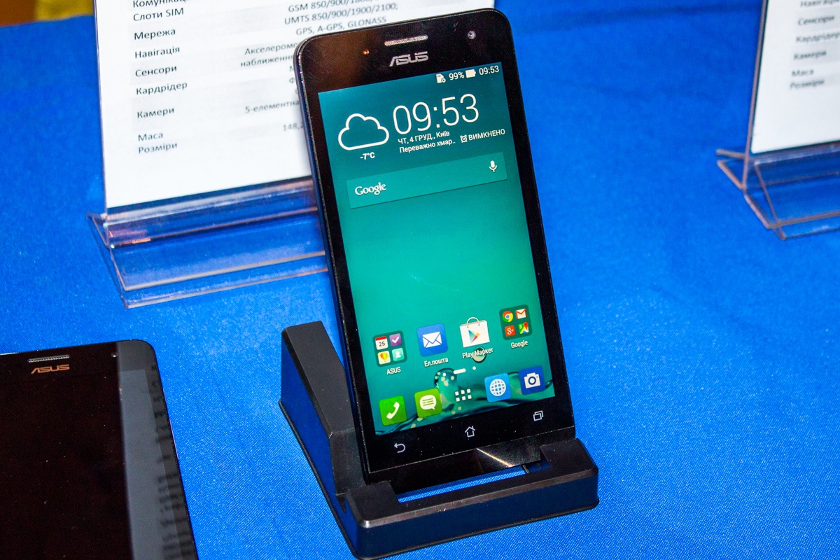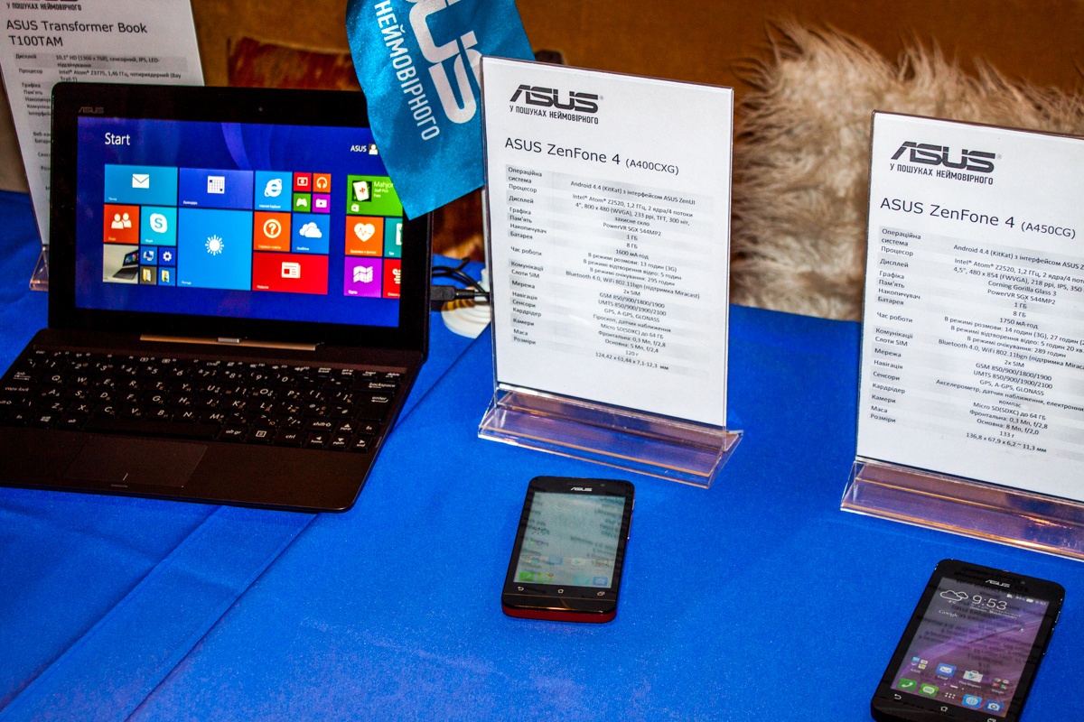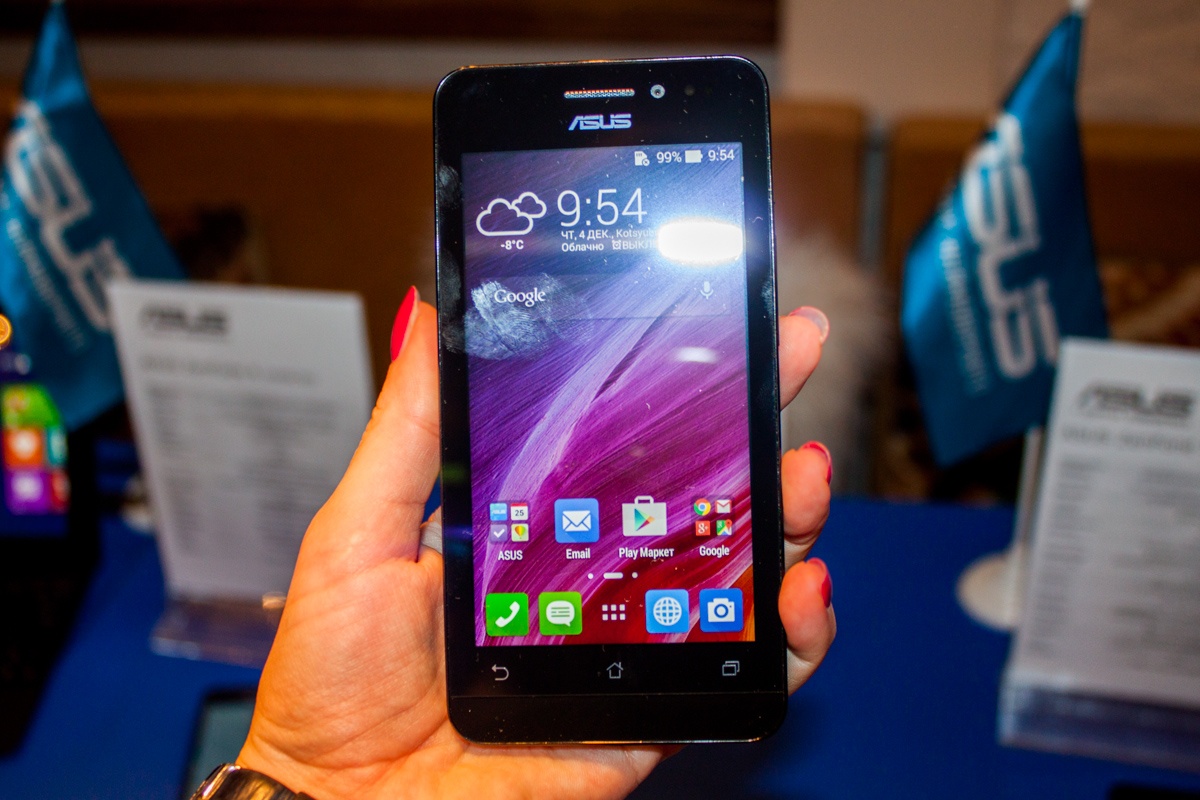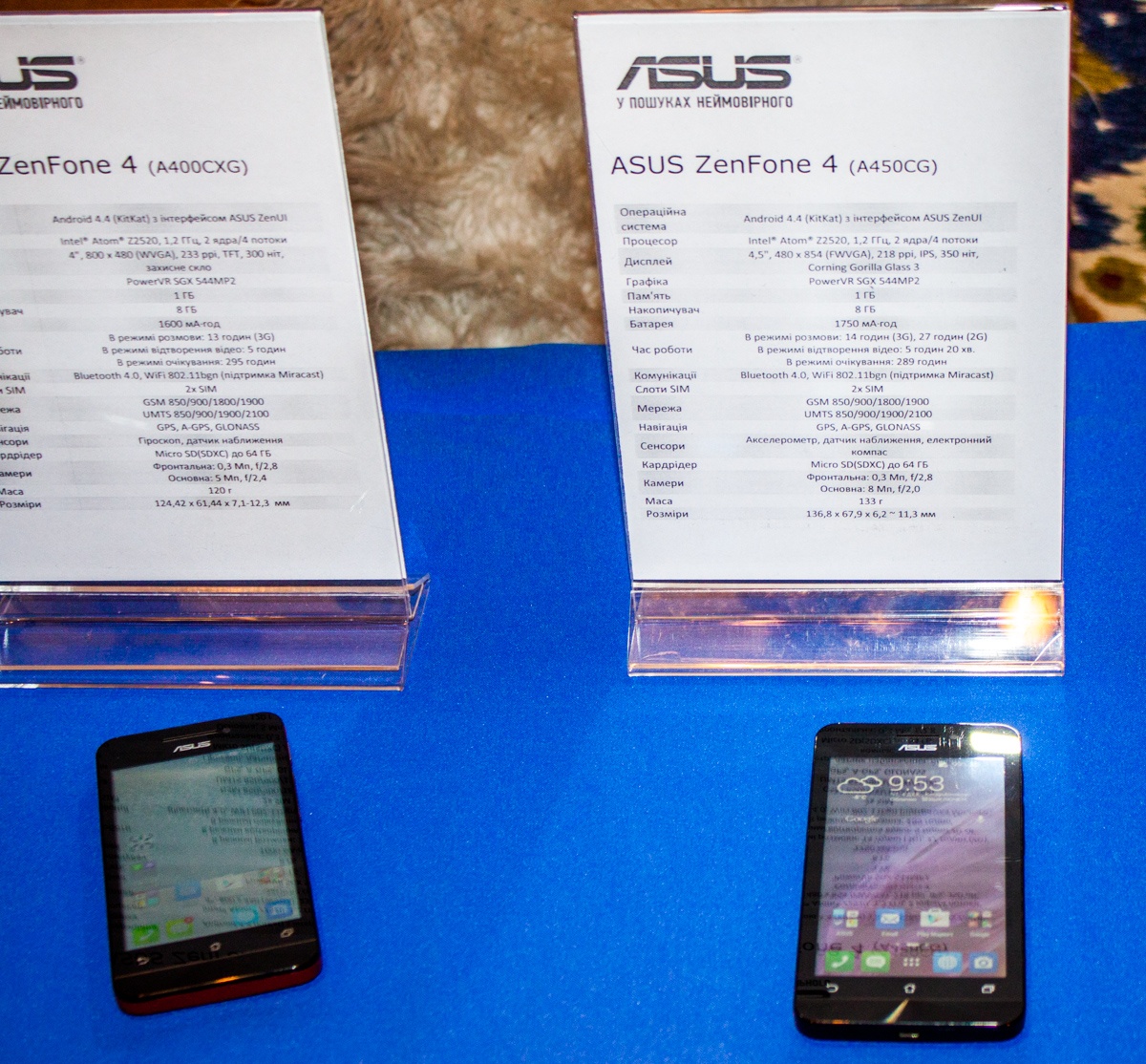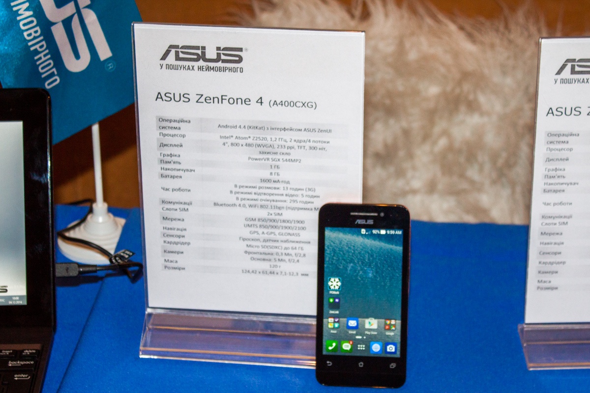 Украинская презентация новинок серий Zenfone и Transformer Book от ASUSВчера компания ASUS анонсировала старт продаж в Украине новой линейки бюджетных смартфонов Zenfone, а также новинок из серии «два в одном» - Transformer Book. Наши впечатления от знакомства. Новая линейка смартфонов Zenfone на базе процессоров Intel Atom объединила в себе сразу пять устройств, как говорится, на любой вкус, цвет, размер кармана и кошелька. Аппараты получили схожий лаконичный дизайн, без ненужных излишеств, обилие цветовых решений, а еще такие общие ключевые спецификации, как поддержка dual-SIM, беспроводные модули Wi-Fi a/b/g/n, Wi-Fi Direct, Bluetooth 4.0 с GPS, A-GPS и ГЛОНАСС, слот для MicroSD-карт и Android KitKat 4.4 c фирменным интерфейсом ZenUI "из коробки". И еще одна приятная новость для нас и для вас по итогам презентации — новинки ASUS получат обновление до Android 5.0 Lollipop. Предположительные сроки апдейта — март-апрель 2015-го года. ASUS Zenfone 4 (A400CXG)