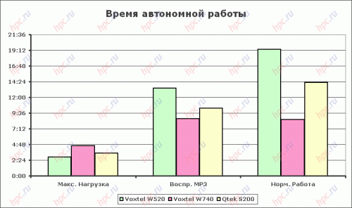 Съемка видео возможно только в разрешении 176x144 со звуком или без него. Формат записи – WMV. По умолчанию в коммуникаторе установлено ограничение на продолжительность видеоролика в 30 секунд, которое всегда можно откорректировать. 30-секундный видеоролик в максимальном качестве занимает около 3 Мб. Качество видео - обычное для коммуникаторов. Время автономной работыЕмкость аккумулятора W520 составляет 1100 мАч. Как обычно, время автономной работы тестировалось в трех основных режимах: 1. Режим максимальной нагрузки. Яркость подсветки выставлена на максимум, громкость динамика тоже, включен GSM-модуль, Bluetooth и Wi-Fi, через Windows Media Player в цикле проигрывается "тяжелый" видеоролик. Время автономной работы составило 2 часа 50 минут. 2. Нормальная работа. Bluetooth и Wi-Fi отключены. Яркость подсветки установлена на второе по счету деление. На коммуникаторе было запущено чтение текста в программе Haali Reader с автоматической прокруткой. Время работы составило 19 часов 22 минуты. 3. Воспроизведение МР3. Bluetooth и Wi-Fi выключены. Подсветка – на минимальном значении (примечание ниже). Прослушивание через наушники на максимальной громкости. Использовался Windows Media Player и файлы с битрейтом 192 Кб/c. Время работы – 13 часов 25 минут. Результаты, которые показал W520, заслуживают похвалы. Так, в режиме чтения электронных книг и прослушивания музыки наш герой работает значительно дольше большинства конкурентов. Аппарат несколько уступает только Qtek S200 в режиме максимальной нагрузки. Это может быть связано с программными особенностями управления беспроводными интерфейсами.