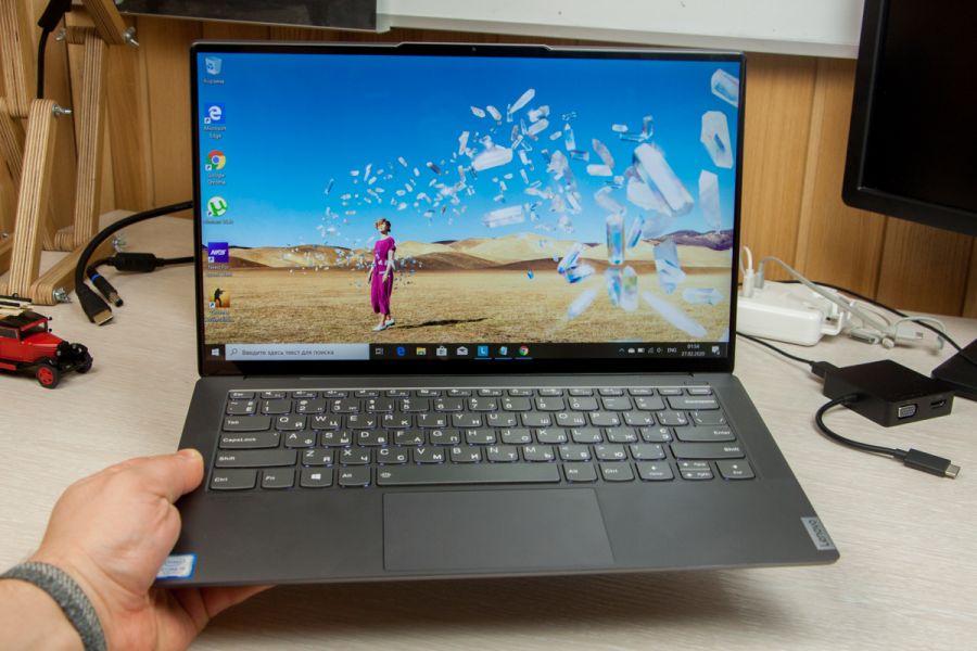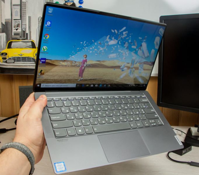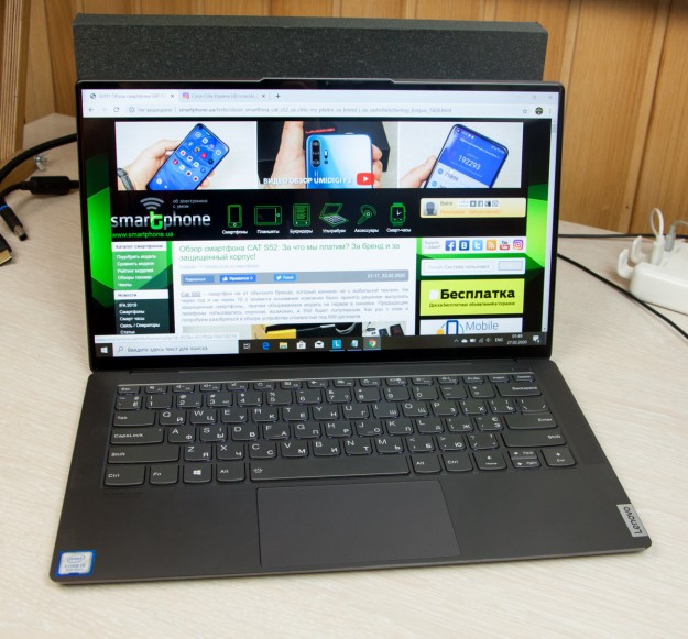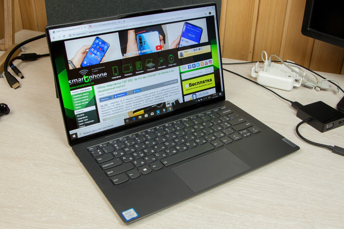 При ценнике в $1500 по-другому и не должно было быть?! Тут ошибаетесь, так как есть аналоги и дороже. Дизайн и корпус Дизайн Lenovo Yoga S940 - его самая впечатляющая особенность. 14-дюймовый дисплей сумели втиснуть в маленький и элегантный корпус. Габариты ноутбука 319,3 х 197,4 х 1 4,2 мм, вес 1,2 кг. Устройство не из числа ультракомпактных, но маленькое. Открываете его, включаете дисплей и понимаете, что для такого экрана – 100% подходящий корпус. Материалы практичные, в большей мере это алюминий. Выглядит дорого и цвет не броский. Кнопки на клавиатуре мягкие и не щелкают при нажатии. Мне такие нравится, привыкаешь быстро к необходимому усилию и расположению кнопок. Трекпад достаточного размера, его отзывчивость не вызывает нареканий. Динамики расположены справа и слева от клавиатуры. Их 4 по 2 Вт, звучат прямо в Вас, поддерживают звучание Dolby Atmos. Мне понравились. Дисплей Отрываете ноутбук и все внимание с корпуса переключается на дисплей. Это 14-дюймовая IPS матрица 1920х1080 - Full HD 16:10. Дисплей плавно скругляется к торцам, стекло немного изогнутое. Таким образом создается впечатление еще большей диагонали. На смартфонах такую форму называют 2,5D стеклом. Запас по яркости и контрастности высокий. Углы обзора отличные, угол наклона крышки видно по фото ниже. В верхней части экрана предусмотрена площадка. На ней камера и место, куда будете браться руками для открытия и закрытия ноутбука. В следующих поколениях устройства я бы постарался избавиться от этого «практичного» элемента дизайна. А если уже и реализовали так, то почему забыли о фирменной шторке, которые скрывает камеру? Места достаточно. Аппаратная начинка Мой тестовый Lenovo Yoga S940 с индексом (Lenovo Yoga S940-14IWL Iron Grey 81Q7004FRA) оснащен процессором Intel 8-го поколения Core i5-8265U. Дискретной графики нет, нам предлагают работать только с интегрированной Intel UHD Graphics 620. Так что покупатель должен обходится без тяжелых игр. В Chrome потребовалось открыть более 30 вкладок, чтобы увидеть небольшое замедление. Оперативной памяти 16 ГБ (LPDDR3 2400 МГц), встроенный накопитель - SSD на 500 ГБ. Места под файлы мало и за заплаченную сумму хотелось бы уже минимум 1 ТБ. Скорость чтения с накопителя до 3400 МБ/с, а записи – до 1900 МБ/с. Это отличные цифры. Порты и разъемы Самое главное, что покупателю предлагается два порта Thunderbolt 3 до 40 Гбит/с, один USB Type-C USB 3.1 и разъем для наушников 3,5 мм. Из коробки классическую USB 2.0 вставить некуда. HDMI, DisplayPort, LAN RJ-45, USB 2.0 – этого всего нет. Потребуется – купите расширитель Lenovo USB-C Travel Hub (4X90M60789). В нем даже VGA выход есть. Кстати, порт для наушников могли бы тоже убрать, я уже давно перешел на беспроводные. Вот ссылка на обзор моих PadMate PaMu Slide Mini. Автономность Время автономной работы порадовало. На Full HD дисплее это не менее 14 часов в режиме набора текста и прослушивания музыки через динамик (подсветка на уровне 75%). Читал, что на 4K дисплей этот ноут забирает заряд быстрее раза в 2-3, так что я бы советовал остановится на Full HD версии. Полезности Lenovo – это уже не просто железо. В нашем случае есть пара интересных опций на программном уровне в дополнение к Windows 10 Home. Во-первых, возможность войти в систему, просто глядя на ноутбук с помощью распознавания лиц. Камера, для справки, хорошая, на 1 Мпикс. Еще она умеет отслеживать движение глаз, но на тестовом экземпляре этой функции не нашел. Во-вторых, поддерживается Alexa. Только ж мы в Украине и это не очень а