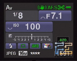 Правее находится монохромный сегментный ЖК дисплей с изумрудной подсветкой, яркость которой можно регулировать (правда, значений яркости всего два) либо вовсе отключить. Тут же находится клавиша введения экспосдвига, выбора уровня чувствительности, а также клавиша спуска затвора, окружённая рычажком питания, который заодно позволяет просматривать глубину резкости при просмотре через видоискатель либо просмотра компоновки кадра при просмотре через экран.