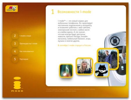 I-modei-mode - сеть мобильной связи, созданная японской компанией NTT DoCoMo. Запущена в эксплуатацию в феврале 1999 года. Сеть i-mode предоставляет пользователю возможность постоянного подключения к Интернет через портал NTT DoCoMo, который содержит ссылки более чем на 1500 ресурсов, которые предоставляют доступ к банковской и финансовой информации, прогнозам погоды, телефонным справочникам, онлайновым магазинам, заказу билетов и др.